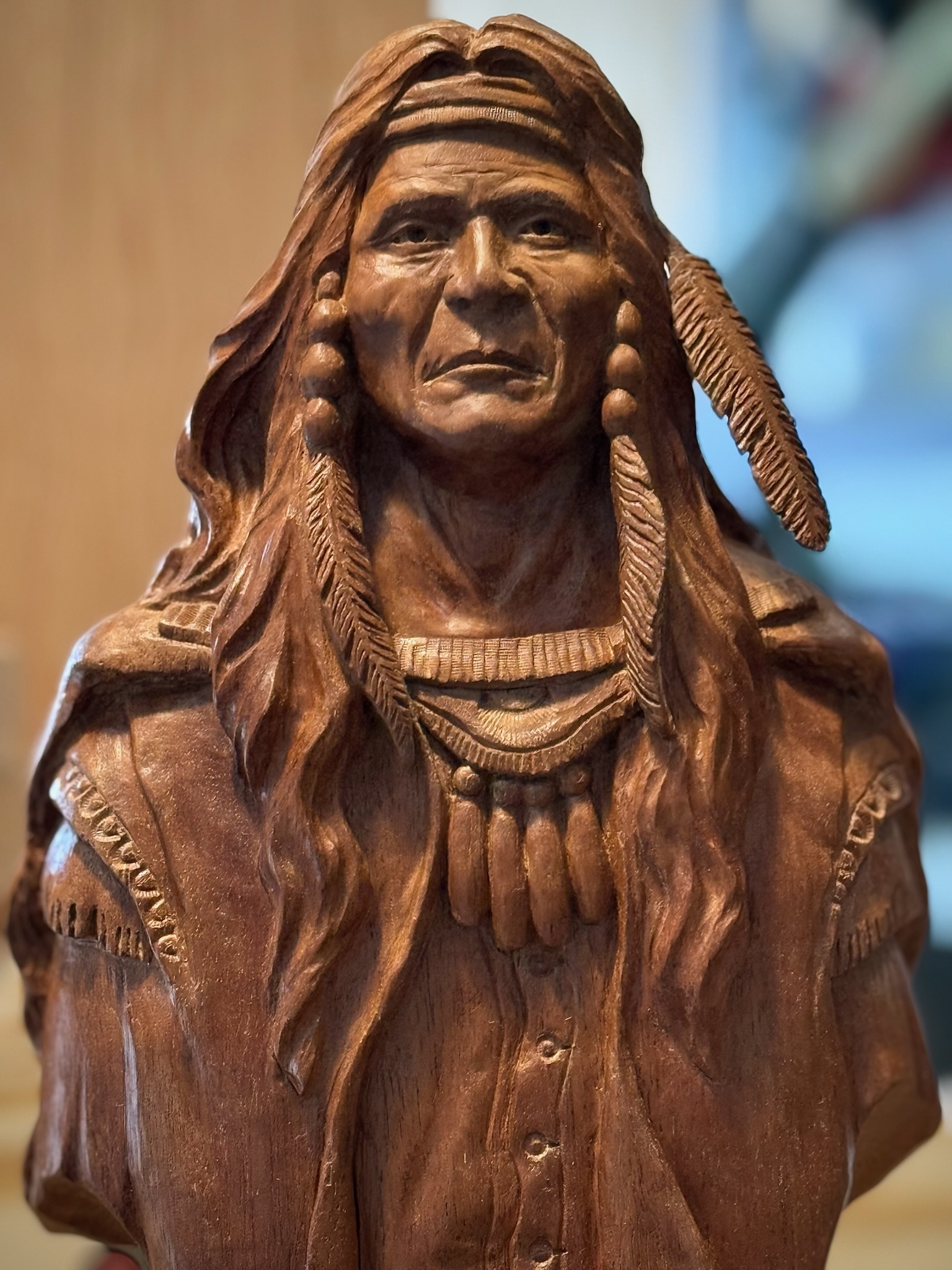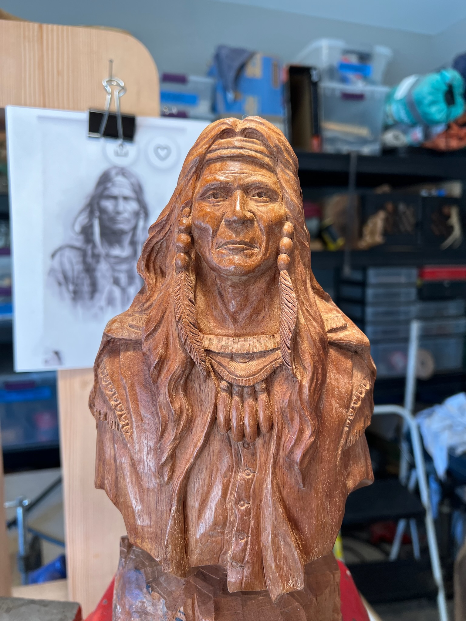Finished carving is 13 1/2″ tall. Carved in Mahogany.